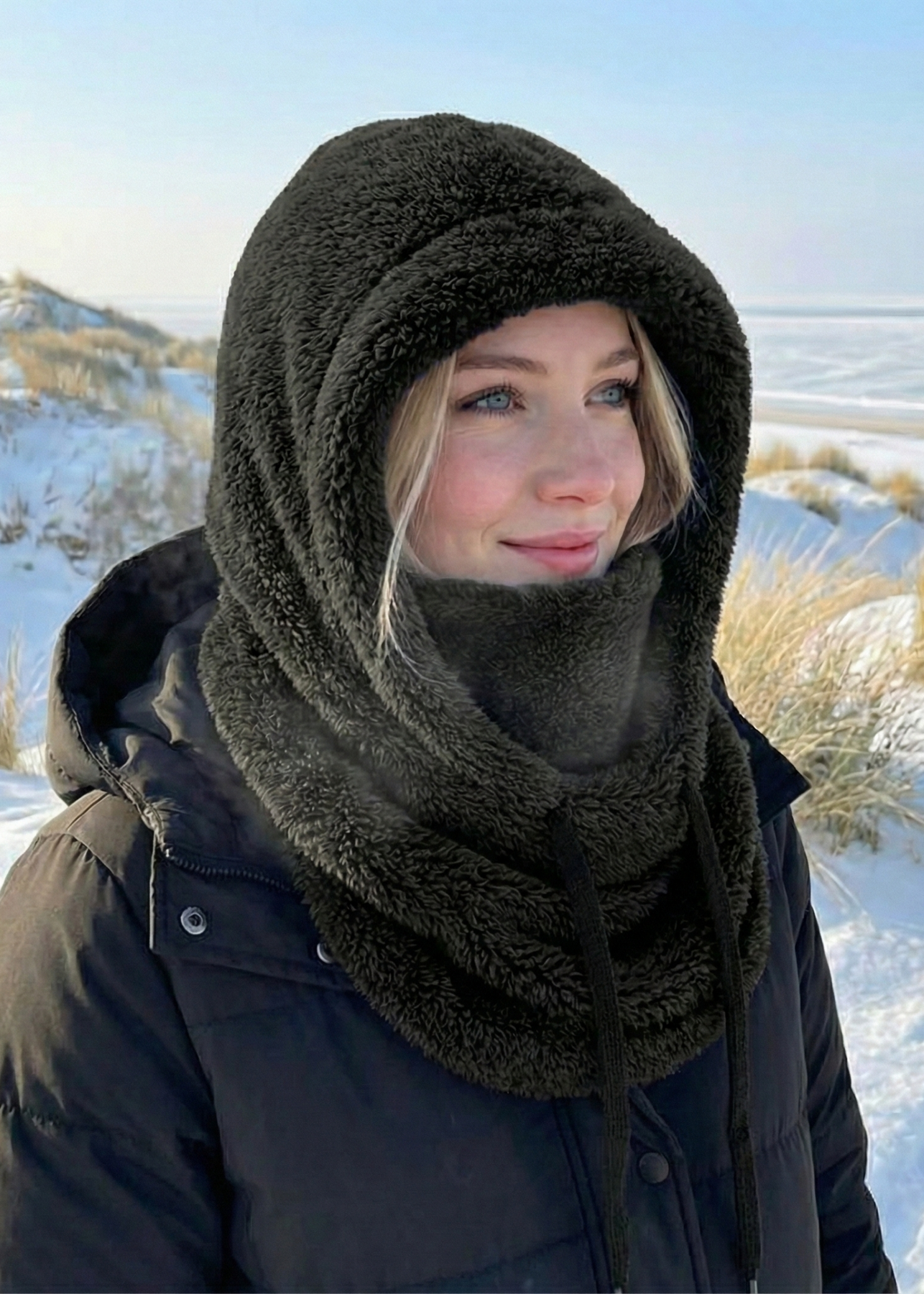 The Elis hoodie is designed to face the Canadian winter without complications. Its all-in-one design replaces your hat, scarf, and face covering with a single, practical piece. The thick thermal sherpa fleece lining wraps your head, neck, and face to keep warmth in, even in the coldest weather.